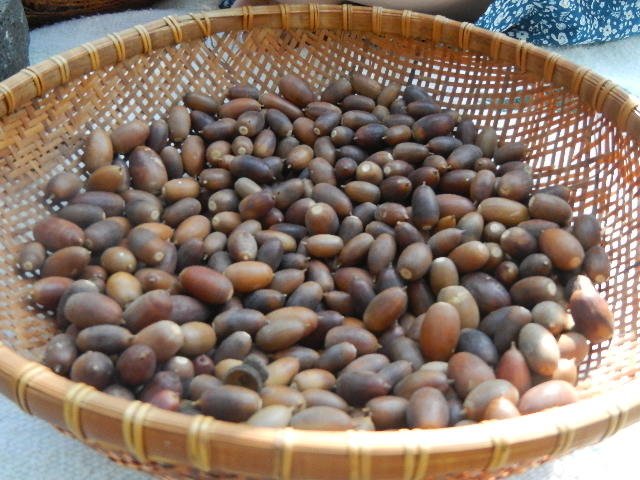 We met for the acorn ceremony late morning in a park filled with oak trees. The ceremony was a bit awkward at first, in a way that we really didn’t know what we were doing except for one noble act – our intention was to recreate a ceremony to honor the oak trees and new season, in the spirit of the Miwok who had lived on the land. So, as a collective group, we decided to first share with each other knowledge we had of oak trees, recognizing the many different kinds of oaks, witnessing their unique leaf shapes and acorn varieties and discussing the areas where they grow in California and beyond. We shared acorn recipes – acorn pancakes, mush or bread. We discussed best ideas to leach tannins of the grounded nuts to make into edible flour. We each stood by an oak tree, resting our hands on a trunk to feel the energy from our arms into the trunk, down to the roots and than back up into our feet and into our bodies, creating a visual energy cycle of connection that we ultimately have with all of nature. We brought acorns to process together, and the music of the pestle against the stone mortar created a rhythm of sound much like that of what would have been heard in a Miwok village, knowing we were near an old village where today only a wooden sign marks its history. We stood in circle together recanting gratitude for the season, giving tribute to the gifts of the day – a blue sky, a soft warm wind, a child’s nearby laughter.
